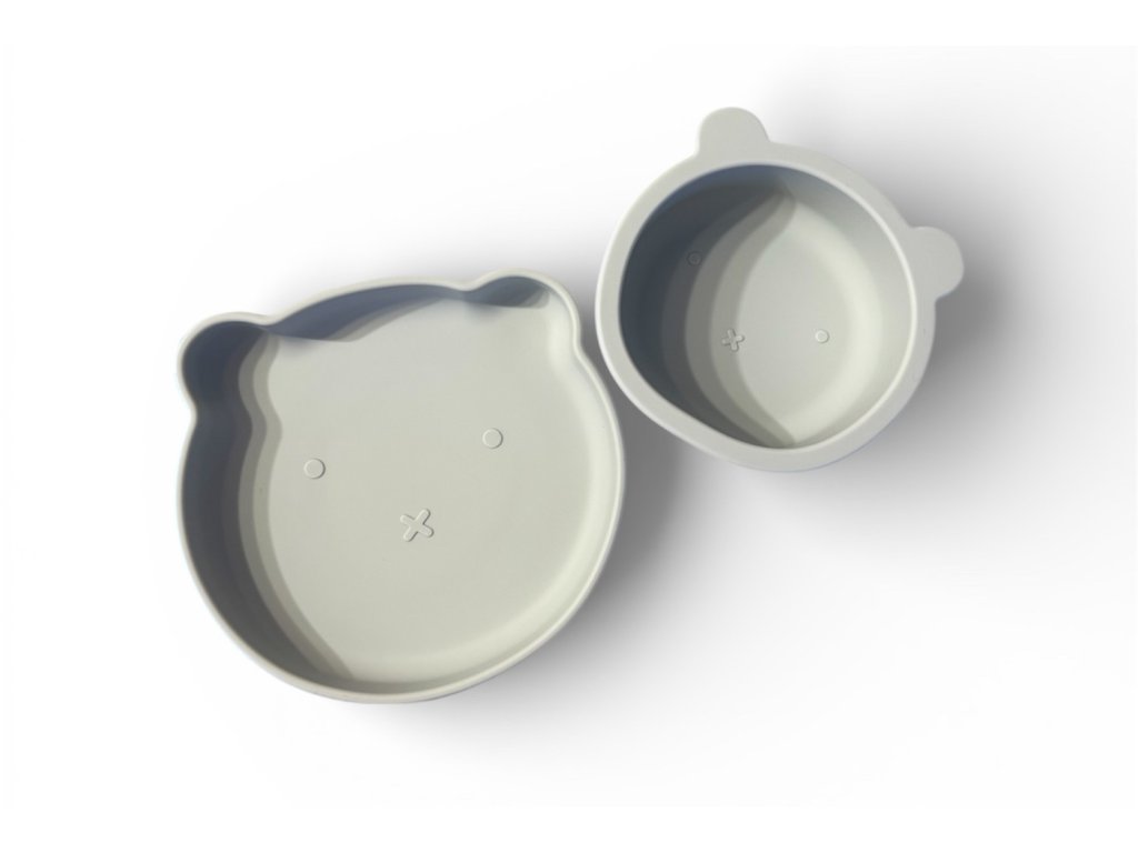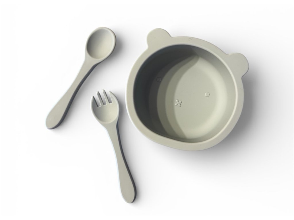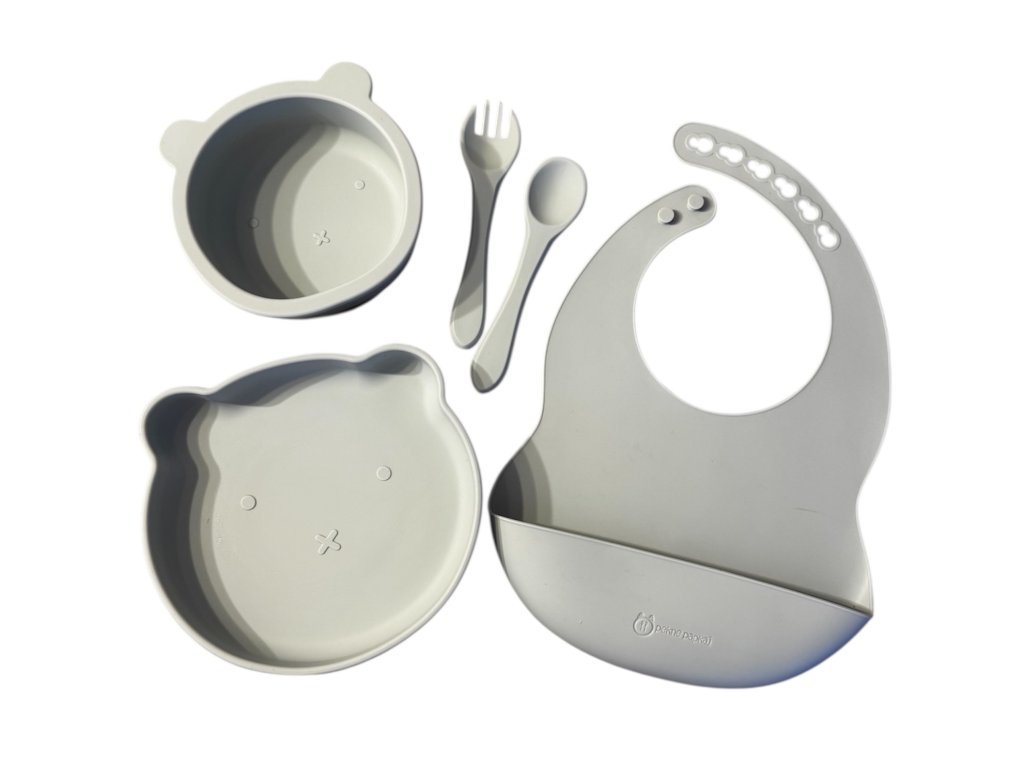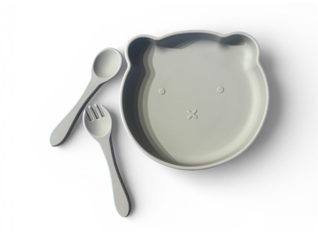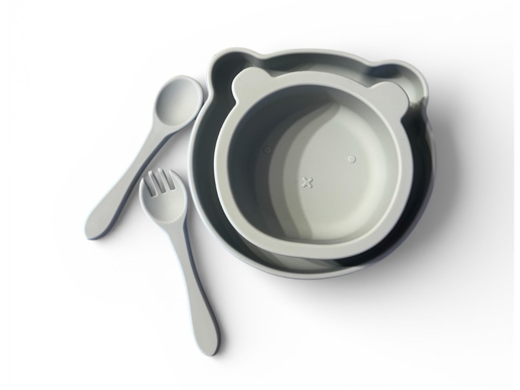 Rozveseľte deťom stolovanie týmto štvordielnym silikónovým jedálenským setom, ktorý je vhodný od začiatkov prikrmovania, ale rovnako poteší aj starších. Set obsahuje roztomilú hlbokú misku s uškami a prísavkou, plytký tanierik s uškami a prísavkou, príbor, ktorý vie dieťatko dobre uchopiť a minimalistický praktický podbradník. Prísavka udržuje misku pevne a bezpečne na stole. Set je vhodný do umývačky riadu.